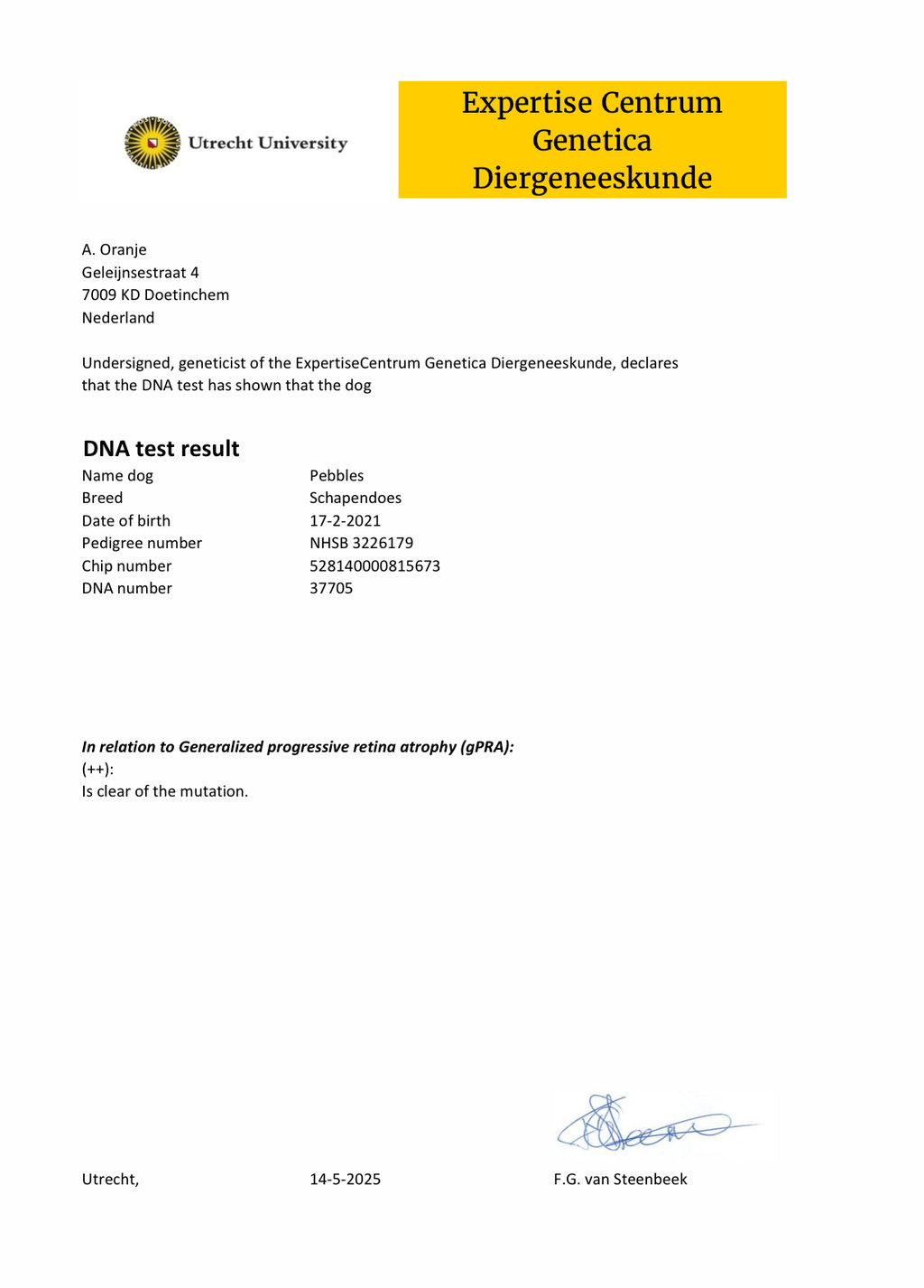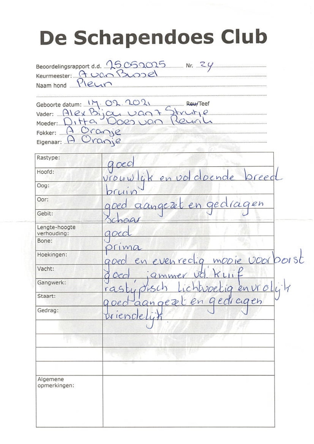 Ik laat de ouderdieren onderzoeken om erfelijke aandoeningen zoveel mogelijk uit te sluiten. De pups worden verkocht met een koopcontract.
