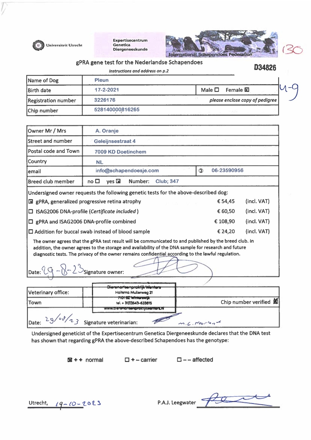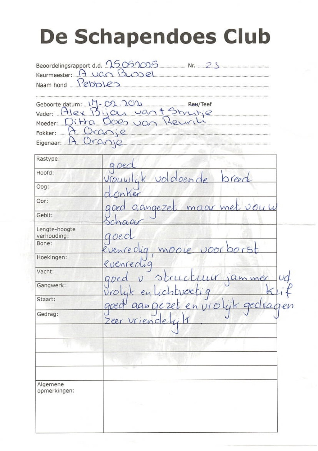 Ik laat de ouderdieren onderzoeken om erfelijke aandoeningen zoveel mogelijk uit te sluiten. De pups worden verkocht met een koopcontract.